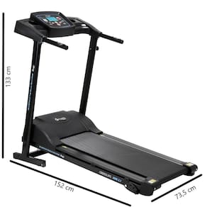 - Possui monitor em LED com 5 janelas e funções, sendo elas: tempo, velocidade, distância, calorias e batimentos cardíacos. Tem 3 níveis de inclinação, 4 programas pré-definidos de velocidade. É dobrável e possui rodinhas para transporte.