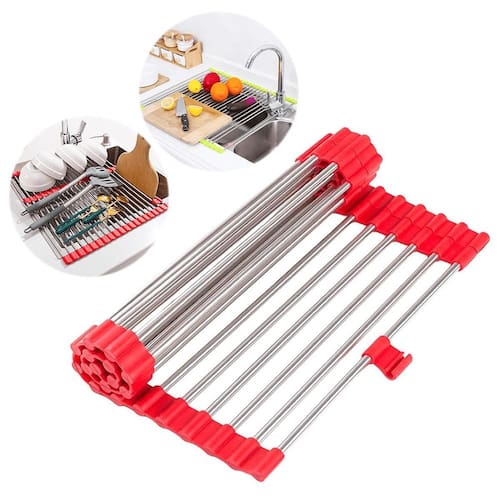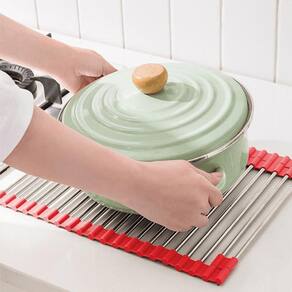 O Escorredor Esteira serve para escorrer água de alimentos ou louças. Basta desenror e colocar sobre a pia, para escorrer legumes e hortaliças que foram lavadas, peças de louças e até apoiar panelas e refratários quentes, servindo de base na mesa. O escorredor é feito em inox e silicone flexível, produto duradouro, pratico, fácil de limpar e guardar.