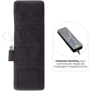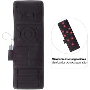 Esteira massageadora, contém 10 motores alinhados simetricamente que faz com que a massagem tenha um efeito relaxante e revigorante. Possui também um sistema de aquecimento lombar. Seus comandos são fáceis, sendo um produto prático para o dia a dia; Controle remoto; Adaptador de tomada bivolt automático; Manual de instruções;Especificações: