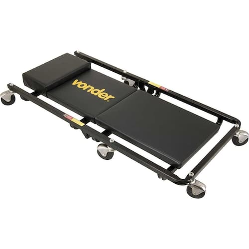 Material da esteira para mecânico: Estrutura reforçada em metalon com base rígida em aglomerado, forrado com espuma e revestido com material sintético | Cor da esteira para mecânico: Preta | Dimensões aberta: 10 cm x 42,5 cm x 91 cm | Dimensões fechada: 20 cm x 42,5 cm x 46 cm | Capacidade máxima: 100 kgf | Massa aproximada (peso) (kg): 6,87 kg