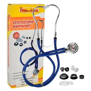 O Estetoscópio Rappaport Premium é indicado para a ausculta cárdio-respiratória. Ele é um esteto completo com tubo duplo para ausculta mais clara e precisa. Inclui olivas e diafragmas para conversão em diferentes formas de uso. É um aparelho de uso médico que requer treinamento e prática para o uso correto. Mais detalhes do Produto:- Uso adulto e pediátrico: Sim;- Diafragmas super sensível: Sim;- Tubo duplo resistente: Sim;- Produzido com os materiais da mais alta qualidade: Sim;- Conteúdo da Embalagem:- Par de oliva rosqueável dura;- Par de oliva rosqueável macia;- Par de oliva rosqueável silicone;- 2 pares de membranas de plástico rígido;- Anel rosqueado de cobre cromado (Infantil, Adulto);- Base rosqueada de cobre cromado que possibilita troca do sino ou diafragma (Infantil, Adulto);- Câmara de som em liga de alumínio (oxidado ou anodizado);- Tubo rotatório central em cobre cromado;- Tubo duplo de PVC ligado através de anéis metálicos;- Fone biauricular de cobre cromado;- Diafragma aberto (sino prolongador) tamanho pequeno;- Diafragma aberto (sino prolongador) tamanho médio;- Diafragma aberto (sino prolongador) tamanho grande;- Auscultador;O Estetoscópio Rappaport Premium é indicado para a ausculta cardiopulmonar. É um estetoscópio completo, de baixo peso, formado com tubo em “Y” moldado em PVC de peça única para melhor transmissão do som, com fone biauricular em cobre cromado, que permite auscultar simultaneamente o som com os dois ouvidos e auscultador para ausculta mais precisa e eficiente.Possui par de olivas macias e diafragma de alta sensibilidade, uma câmara de som em liga de alumínio e anel rosqueado de cobre cromado. Os sons são obtidos através do contato do diafragma com o organismo e são transmitidos através da câmara de som, tubo transmissor, tubo de PVC e auriculares até o ouvido do profissional. - Características:- Leve e compacto- Diafragmas de alta sensibilidade- Tubo moldado em PVC de peça única para melhor transmissão do som- Fone biauricular em cobre cromado- Par de olivas macias- Indicações: indicado para amplificações dos sons pulmonares, cardíacos e demais sons do corpo - ITENS INCLUSOS:01 Estetoscópio Duplo Rapapport Premium01 Par de Olivas Macias01 Par de Diafragmas de alta sensibilidade01 Auscultador de Dupla função01 Manual de Instruções GARANTIA 01 Ano **Produto com selo do Inmetro. *Registro na Anvisa: 80275310063.