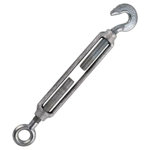 Esticador Para Cabos De Aço De Espessura Ate 1/2 pol. 12,7 MM , Corpo Em Ferro Maleável Galvanizado Com Terminais Gancho E Olhal Em Ferro Galvanizado. Indicado para tensionar esticar cabos de aço e cordoalhas. Não deve ser utilizado em aplicações de movimentação de cargas. Marca: Starfer Ref.: 05057035