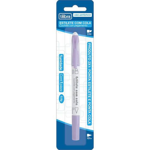 Cortar e colar nunca foi tão fácil e prático com o Estilete com Cola da Tilibra. Este produto possui uma ponta com estilete e a outra com cola líquida na cor lilás.