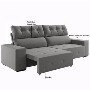 - Pode Ser Montado Invertido?: Não - Categoria: Sofá - Material da Estrutura: Eucalipto - Espessura da Estrutura: 21 mm - Escala de Brilho: Semi-Brilho - Quantidade de Lugares: 4 - Peso Suportado: 180 kg - Escala de Conforto: Firme - Medidas do Sofá Aberto (A x L x P): A:100 X L:230 X P:140CM - Como os Móveis Chegarão em Minha Casa?: Desmontado em caixas, acompanhado de todas as peças, ferragens e manuais para montagem. - Grau de Dificuldade de Montagem: Médio - Sistema de Montagem: Parafusos, cavilhas, cola e minifix. - Indicação de Uso: Sala de Estar - Observação: Objetos decorativos que aparecem nas imagens, não acompanham o produto. A capacidade de carga considera que o peso está distribuído igualmente pela peça. As cores das imagens podem variar de acordo com as configurações do seu monitor e/ou da iluminação do ambiente onde o produto está inserido. As imagens indicam uma sugestão - Recomendação de Manutenção: Utilizar pano levemente umedecido, seguido de pano seco. Não utilizar quaisquer produtos abrasivos. - Garantia (dias): 90 Dias - Quantidade de Pés: 8 - Revestimento/Acabamento: Tecido - Tipo do Assento: Retrátil - Tipo de Sofá?: Sofá - Tipo de Encosto: Reclinável - Enchimento do Encosto: Fibra Siliconada - Enchimento do Assento: D-23 - Composição do Tecido: Veludo - Possui Gavetas?: Não - Possui Portas?: Não - Possui Espelho?: Não - Possui Prateleiras?: Não - Possui Puxadores?: Não - Possui Tampo?: Não - Possui Rodízios?: Não - Possui Sapatas?: Não - Possui Pés?: Sim - Pés com regulagem de altura?: Não - Sofá-Cama: Não - Possui Borda de PVC nas Bordas?: Não - Necessita de Montagem: Sim