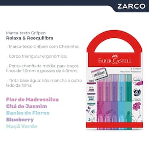 Estojo 5 cores marca texto marcador grifpen com cheirinho ponta chanfrada faber castell Cor: relaxa & reequilibra Transforme suas leituras e anotações em uma experiência sensorial com o marca-texto grifpen com cheirinho faber-castell. Combinando cores vibrantes e fragrâncias exclusivas, este marca-texto é perfeito para quem busca destacar suas informações de maneira prática, elegante e inovadora. Seu formato triangular ergonômico garante conforto durante o uso, enquanto a ponta chanfrada permite traços finos ou grossos com facilidade. Além disso, a tinta à base de água não mancha o verso da folha, garantindo a qualidade das suas anotações. Seja para estudos, trabalho ou organização pessoal, o grifpen oferece durabilidade e estilo em cada marcação. Principais características: . Formato triangular ergonômico: o design triangular foi criado para proporcionar um manuseio confortável, evitando que o marca-texto escorregue e permitindo longas sessões de uso sem cansaço nas mãos; . 5 cores vibrantes: o grifpen vem em cinco cores vivas e intensas, perfeitas para destacar informações importantes em seus textos e documentos. Deixe suas anotações mais organizadas e visuais com estas tonalidades que chamam atenção na medida certa; . Ponta chanfrada média - traços de 1.0mm a 4.0mm: a ponta chanfrada proporciona versatilidade para criar traços finos ou grossos, atendendo a diferentes necessidades de marcação. Use a extremidade mais fina para detalhes e a mais grossa para sublinhar ou destacar trechos maiores; . Tinta à base de água - não mancha o outro lado da folha: esqueça as marcas indesejadas no verso do papel a tinta à base de água do grifpen garante que suas marcações sejam nítidas e não vazem, mantendo suas páginas limpas e organizadas; . 5 aromas exclusivos: além das cores, o grifpen oferece uma experiência olfativa única. Cada cor vem com um aroma especial que transforma suas leituras e anotações em um momento agradável e relaxante. Fragrâncias inclusas: . Relaxa & reequilibra: maçã verde; banho de flores, blueberry, chá de jasmim, flor de madressilva; Atenção: antes de finalizar o pedido, escolher o modelo com as fragrâncias desejadas. Com o marca-texto grifpen com cheirinho faber-castell, você não só destaca suas informações de forma eficaz, mas também transforma o ato de estudar ou organizar em uma experiência completa e prazerosa. A faber-castell, conhecida por sua excelência e inovação, oferece neste produto uma combinação perfeita de funcionalidade e estilo. Adquira já o seu grifpen e leve cor, conforto e aroma para suas anotações Especificações: . Marca: faber-castell; . Modelo: marca-texto grifpen; . Sortimento: 5 cores; . Ponta chanfrada média: para traços finos de 1.0mm e grossos de 4.0mm; . Registro inmetro: 009475/2024. Atenção: . Não recomendável para crianças de até 3 três anos, por conter parte s pequena s que pode m ser engolida s ou aspirada s ; . As cores apresentadas podem sofrer pequenas alterações de acordo com as configurações da tela do aparelho. Vantagens de comprar na zarco br: . Envios em até 24 horas úteis: com a zarco br, seu pedido é processado rapidamente e enviado em até 24 horas úteis, garantindo agilidade e eficiência na entrega; . Produtos novos: cada item disponível é totalmente novo, assegurando que você receba um produto em perfeitas condições, sem uso prévio; . Produtos com : com a zarco br, seus produtos contam com oficial, oferecendo segurança e tranquilidade na sua compra.