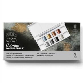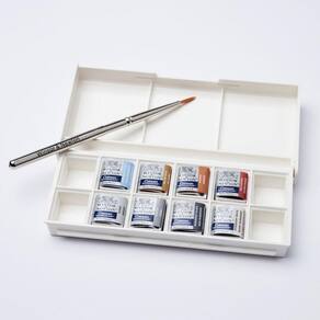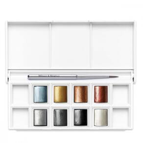 Idealizada para efeitos metálicos na aquarela, produz um acabamento iridescente que destaca-se pela força de sua cor. as aquarelas são formuladas com pigmentos artísticos de alta qualidade, consistência e transparência uniformes, resiste à luz e ação do tempo. miscível com qualquer outra cor de aquarela, proporciona efeitos incríveis e pode ser utilizado em papéis escuros. Acomodado em um estojo com 8 cores e espaço para mais 4 pastilhas adicionais, acompanha também um pincel Winsor & Newton para Aquarela. Seleção com as seguintes cores metálicas: Azul iridescente, Ouro, Bronze, Cobre, Prata, Estanho, preto iridescente e Branco iridescente. Marca: Não Informado