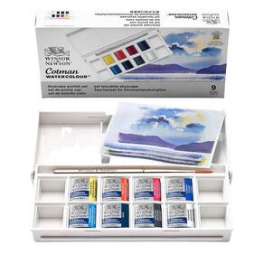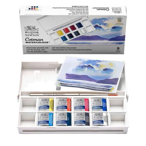 Estojo de Aquarela Winsor & Newton Cotman SKYSCAPE é composto com uma seleção de cores direcionadas para a pintura com tons de céu Estojo cuidadosamente desenvolvido para o artista que deseja usufruir do prazer de pintar ao ar livre, transportando facilmente todo o material que necessita. Aquarela com excelente poder nas cores e transparência inigualável. Estojo composto por 8 pastilhas Cotman e 1 Pincel Winsor & Newton acomodados em um lindo e compacto estojo que pode ser utilizado como godê na mistura das cores. Cores do Estojo: Lemon Yellow Hue Cadmium Red Hue Rose Madder Hue Ultramarine Cerulean Blue Hue Indigo Paynes Grey Chinese White Ean: 884955081136