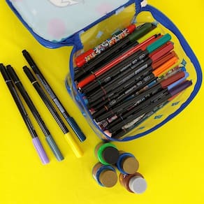 Detalhes: estojo em pvc cristal, material resistente e de fácil limpeza, capacidade para mais de 100 canetas, fechamento em zíper.