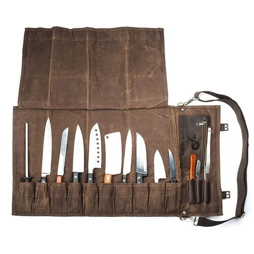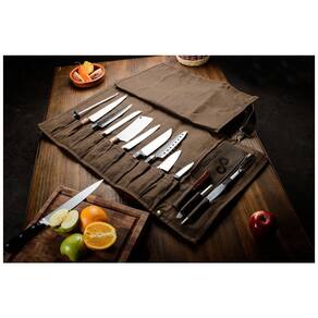 ARTESANATO SUPERIOR Este saco de rolo de faca é feito à mão por artesãos experientes com lona encerada grossa e impermeável e o melhor couro de grão superior disponível. Usamos rebites premium, bem como fivelas de latão resilientes para garantir durabilidade de longa duração e maximizar a segurança. ACESSIBILIDADE CONVENIENTE Cada bolsa de kit de facas de nível profissional contém 10 facas de cozinha e contém um bolso com zíper que contém acessórios como colheres, descascadores, amoladores de facas, tesouras de cozinha e muito mais. Nosso estojo de transporte de facas com 10 slots pode acomodar facas de chef de até 18,5 de comprimento. Ele também contém 3 bolsos utilitários que são perfeitos para aparar facas, varas de amolar, colheres de degustação e outras pequenas ferramentas culinárias Marca: Não Informado