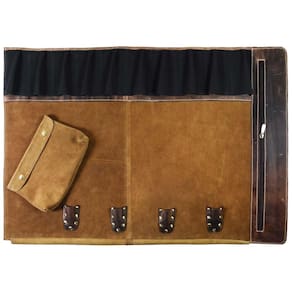 Costurado por artesãos de classe mundial, o Aaron Leather Knife Roll é feito à mão com couro de bezerro de qualidade premium. Existem 2 fivelas vintage elegantes que formam um rolo apertado, com bolsos elásticos para facas e 1 bolsa com zíper durável para manter as facas seguras enquanto você está em movimento. Pode ser como estojo de zenamento de facas zenando 10 facas de cozinha e outros acessórios. Também pode ser como suporte de utensílios. Pode conter facas de até 18 de comprimento Marca: Não Informado