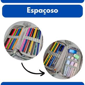 Material de Qualidade e Durabilidade: Fabricado com tecido externo resistente (em cor sólida) e forro interno em poliéster com estampa de material escolar, este estojo oferece proteção robusta aos seus materiais e promete uma longa vida útil. O zíper duplo robusto percorre três lados do estojo, permitindo uma abertura completa e plana (estilo "clamshell") e garantindo um fechamento seguro e suave.