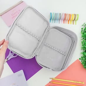 O estojo também conta com um elástico para canetas e lápis, mantendo-os seguros e bem posicionados. Seu fechamento em zíper garante maior segurança, evitando que seus materiais caiam ou se percam.