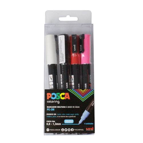 Relação de cores do Kit Posca 3M c/ 4 Canetas: 1. Branco; 2. Rosa; 3. Vermelho; 4. Preto.
