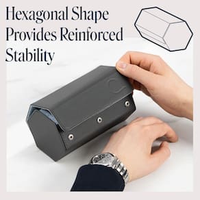 O design hexagonal mantém os relógios seguros — os porta-relógios individuais da Hexagon oferecem estabilidade superior, mantendo seus relógios no lugar certo. A tampa desdobrável fica plana para que você possa trocar os relógios com segurança sem danos.