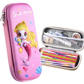 Material: EVA Tamanho: 23 cm* 10 cm* 4,5 cm Peso: 100 g Design fofo de sereia — apresenta um vibrante padrão de sereia de desenho animado 3D em um fundo rosa, adicionando diversão e charme à coleção de papelaria escolar de seu filho. Material EVA durável — Feito de EVA de alta qualidade com um exterior rígido que é à prova d'água, à prova de choque e resistente ao desgaste diário. Armazenamento espaçoso — Medindo 23 × 10 × 4,5 cm, esta bolsa de lápis oferece amplo espaço para canetas, lápis, borrachas, réguas, apontadores e outros materiais escolares. Capa rígida protetora — A capa resistente mantém os itens protegidos contra quedas e pressão, garantindo que lápis e acessórios permaneçam organizados e seguros. Portátil e leve — Com apenas 100 g, esta bolsa para canetas é fácil para as crianças carregarem nas mochilas, adequada para uso diário na escola, viagens e sessões de estudo.