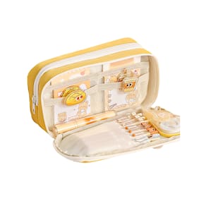 Material: poliéster Peso: 88 g Tamanho: 220 mm* 60 mm* 110 mm Design moderno e fofo: com um design temático de queijo com cores amarelas vibrantes, este estojo de lápis adiciona diversão e estilo ao seu material escolar. Grande capacidade: com várias camadas, oferece amplo espaço para canetas, lápis, borrachas e outros artigos de papelaria, garantindo que tudo permaneça organizado. Durável e de alta qualidade: feito de material de poliéster de alta qualidade, oferece durabilidade duradoura e é fácil de limpar. Perfeito para estudantes: ideal para estudantes do ensino fundamental e médio, este estojo de lápis é uma opção prática e elegante para organizar os itens essenciais da escola. Compacto e portátil: apesar de sua grande capacidade, este estojo de lápis permanece compacto e fácil de transportar, cabendo facilmente em mochilas ou bolsas.