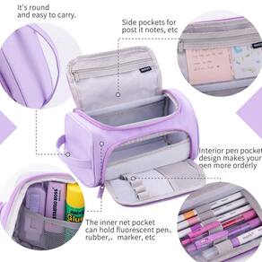 ?Design exclusivo?Abre lateralmente (para facilitar a visualização e o acesso) ou de cima. Fácil de transportar, pulseira portátil. O bolso com zíper na parte superior pode armazenar réguas triangulares e recargas; o bolso interno grande pode classificar a calculadora, bolsos pequenos em ambos os lados podem guardar notas pequenas, borrachas de fita adesiva; o bolso traseiro com zíper pode conter objetos pontiagudos.