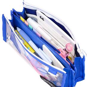 Material: poliéster + TPU Peso: 97 g Tamanho: 220 mm* 115 mm* 75 mm Design funcional: apresenta um design transparente de várias camadas para visibilidade clara e fácil organização de canetas, lápis e outros itens de papelaria. Amplo espaço de armazenamento: com sua grande capacidade, este estojo é perfeito para armazenar uma variedade de canetas, marcadores e pequenos materiais de escritório, mantendo tudo arrumado. Material durável: feito de poliéster e TPU de alta qualidade, garantindo durabilidade duradoura e mantendo uma aparência leve e elegante. Uso versátil: ideal para uso escolar, no escritório e pessoal. Este estojo de lápis é perfeito para estudantes, profissionais e qualquer pessoa que adora armazenamento organizado. Aparência moderna e descolada: projetada com uma estética elegante em azul e preto, oferecendo uma aparência elegante e moderna que combina tanto com jovens estudantes quanto com adultos.