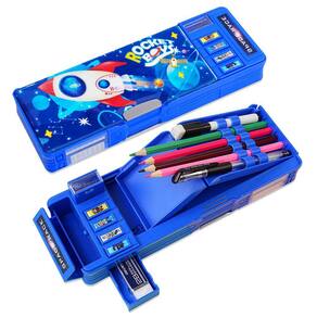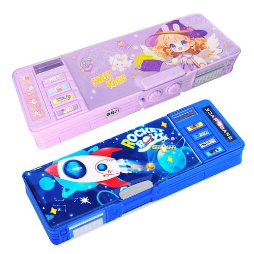 Estojo multifuncional dobrável para meninas e meninos, lindo organizador de caixas de canetas de desenho animado, papelaria com fechadura, apontador, agenda, quadro branco, material escolar, os melhores presentes para crianças (roxo+foguete)