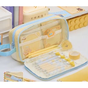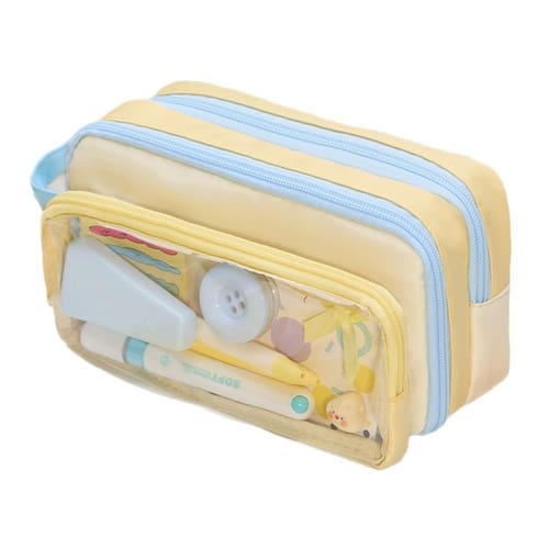 Material: Peso do tecido: 100g Tamanho: 22* 12* 8 cm Grande capacidade e design funcional: compartimentos espaçosos para guardar canetas, lápis, borrachas e outros materiais escolares ou de escritório, mantendo seus itens organizados e acessíveis. Design elegante transparente e colorido: a combinação de amarelo claro e azul com uma frente transparente confere a este estojo de lápis uma aparência elegante e moderna, perfeita para estudantes e profissionais. Seções destacáveis para facilitar a organização: apresenta um design destacável para armazenamento personalizável, permitindo que você organize artigos de papelaria ou acessórios de acordo com suas necessidades. Tecido leve e durável: feito de tecido leve e durável, este estojo de lápis foi projetado para uso duradouro, ideal para uso diário na escola ou no escritório. Portátil e conveniente: inclui um zíper compacto e fácil de usar para transporte sem complicações, seja na escola, no trabalho ou em qualquer lugar.