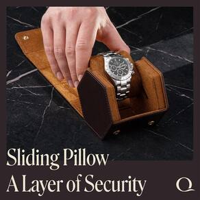 Rolos de relógio portáteis para viagens — Nossos estojos de viagem com rolo de relógio único têm o tamanho perfeito para facilitar o transporte. As almofadas em forma de “M” e o trilho deslizante garantem um estojo de transporte confortável e seguro para relógios.