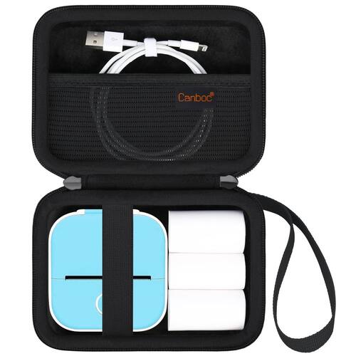 -?Design simples e prático?O espaço interno de armazenamento do estojo da etiquetadora T02 mantém os itens bem organizados e pode armazenar com eficácia pequenos acessórios para impressoras de etiquetas. A faixa elástica embutida pode fixar a impressora de etiquetas e evitar que a impressora m02 caia acidentalmente.