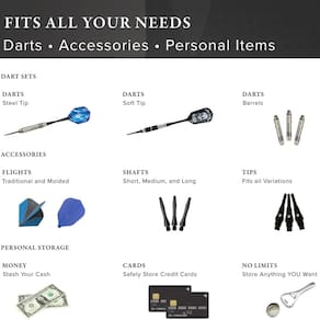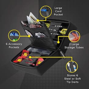 - Muito espaço de armazenamento adicional para tudo o que você precisa em um passeio de dardos, incluindo seis bolsos para voos extras.