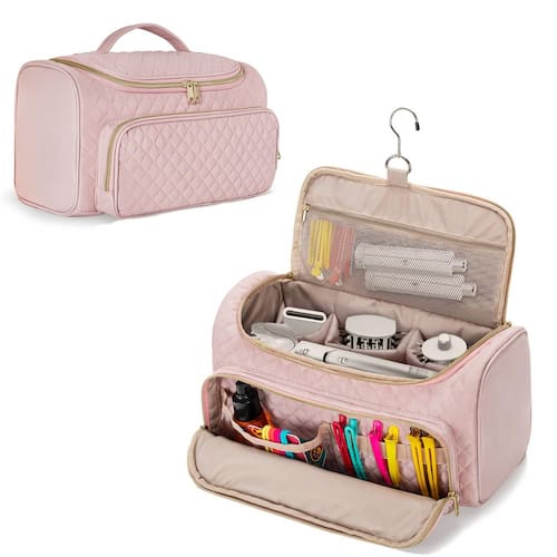 - Mantenha em ordem – Compartimento principal com 3 bolsos acolchoados e 2 bolsas de malha para organizar bem os rolos de enrolar automaticamente, pincéis ovais, concentrador de estilo e até mesmo difusor que define cachos. Um bolso com zíper na aba superior para laços de cabelo ou outros pequenos acessórios.