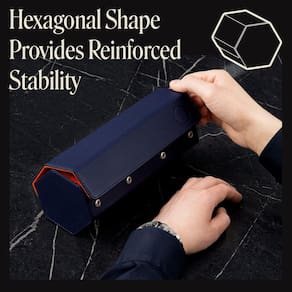 Rolo de relógio de viagem para amantes de relógios de luxo — relógios premium merecem uma capa premium para protegê-los e exibi-los. Nosso rolo de relógio hexagonal de couro napa com interior de veludo foi feito para proporcionar aos seus relógios a experiência Rolls Royce.