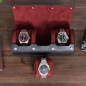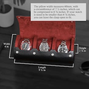 ROTHWELL Estojo de viagem para 3 relógios | Proteção portátil resistente, serve para todos os relógios de pulso e relógios inteligentes de até 50 mm (preto/vermelho) - Separação completa do relógio: cada relógio tem seu próprio compartimento para evitar arranhões. As divisórias sólidas compõem três compartimentos individuais para relógios de até 60 mm para caber perfeitamente. Chega de arranhões nas laterais dos seus relógios de bater uns nos outros como em outros estilos de rolos de relógio! Nosso rolo de relógio mede 24 cm x 10 cm x 6 cm e a circunferência do travesseiro é de 19 cm e é compressível até 16 cm. - Suporte de relógio deslizante: nosso rolo de relógio apresenta um design inovador de almofada deslizante que mantém cada relógio firmemente no lugar. Durante o transporte, os relógios de todas as formas e tamanhos ficam completamente protegidos contra arranhões indesejados. - Parte traseira plana: a parte traseira deste rolo de relógio é plana, então você pode colocá-lo em uma mesa ou mesa sem o risco de ele rolar para fora da borda. Outros rolos de relógio são completamente redondos, deixando-os veneráveis para rolar enquanto estão assentados. - Acessório combinando: cada 3 rolos de relógio é feito à mão pelos mesmos trabalhadores de couro que criam nossas caixas de relógio artesanais. Cada cor combinará perfeitamente com nossas caixas de relógio. Usando 4 botões ocultos para fechar, este rolo de relógio é o acessório de viagem perfeito ou estojo de armazenamento para qualquer entusiasta de relógios. - Presente perfeito: as caixas de relógio Rothwell são presentes perfeitos para o Dia dos Pais, Dia das Mães, aniversários, dia dos namorados, formaturas, feriados, aposentadoria e eventos corporativos. Você certamente encantará até mesmo o destinatário mais difícil de agradar. Nosso design unissex é perfeito para qualquer um dos colecionadores de relógios em sua vida! Ou dê a você mesmo! Seus relógios merecem!