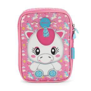 A estampa frontal de unicórnio em vinil é como uma janela para um mundo mágico, adicionando um toque de fantasia ao visual do estojo. O tecido de poliéster estampado com desenhos lúdicos complementa a atmosfera divertida, tornando este estojo uma verdadeira peça de estilo para os pequenos amantes de unicórnios.