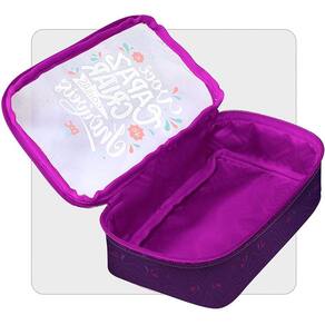 - Formato: 18,7 cm x 10,5 cm x 4,3 cm. - Composição: Tecido e PVC Cristal. - Detalhes: Parte superior transparente de fácil limpeza / Fechamento em Zíper / Estrutura firme.