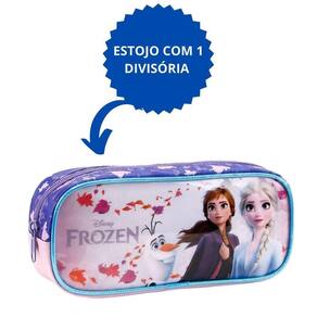 COR: Rosa Tamanho: único Genero: unissex Estojo escolar infantil Frozen Journey - Estojo , produzido em cetim estampado e vivos metalizados . Painel frontal em Cetim 3D , compartimento duplo para melhor organização dos objetos e fechamento em zíper com puxadores personalizados.