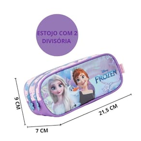 Estojo escolar infantil Frozen Journey DUPLO - Estojo , produzido em cetim estampado e vivos metalizados . Painel frontal em Cetim 3D , compartimento duplo para melhor organização dos objetos e fechamento em zíper com puxadores personalizados.