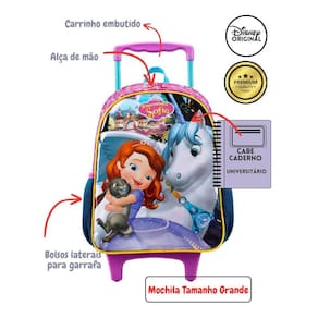 O Kit Escolar Princesinha Sofia Mochila Rodas Lancheira Estojo é perfeito para acompanhar as crianças em suas atividades escolares. Produzido em poliéster resistente, ele oferece praticidade e durabilidade.
