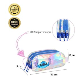 As estampas temáticas da Lilo e Stitch, cuidadosamente detalhadas, adornam o estojo trazendo à vida as personagens favoritas de maneira encantadora