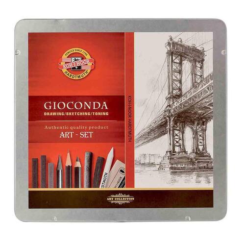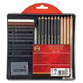 Estojo Kit Para Desenho Gioconda Art Set 24 Pecas Koh-I-Noor Estojo de desenho Gioconda Art Set 8899 metálico Koh-I-Noor Sketching crayon é um estojo composto por 04 lápis crayon giocanda Koh I Noor branco, sépia, sanguinia e sépia escuro, 03 lápis crayon gioconda Koh I Noor Negro graduação 1, 2 e 3, 03 lápis aquarela graduado 2B, 4B e 6B, 01 esfuminho Koh I Noor, 01 limpa tipo Koh I Noor e 03 barras de grafite Koh I Noor, 2B, 4B e 6B, 01 lápis carvão Koh I Noor, 04 barras de crayon, 03 barras de grafite, 01 barra de carvão e 03 barras de crayon negro 1,2 e 3, totalizando 24 peças no estojo. O Estojo de desenho Gioconda Art Set 8899 é uma ótima opção para quem quer adentrar no mundo do desenho.