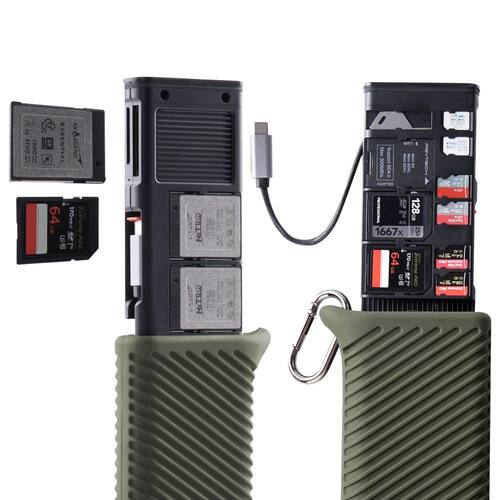 O estojo possui construção durável em plástico, protegido por uma capa de silicone verde musgo com design texturizado. Esta capa não só melhora a aderência, como também protege o dispositivo contra impactos e arranhões durante o transporte. Além disso, o mosquetão incluso permite fácil fixação em bolsas ou cintos, tornando-o uma solução prática e segura para transportar seus valiosos cartões de memória onde quer que você vá.