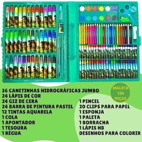 Kit Completo em Maleta Resistente: O conjunto contém 150 peças, incluindo lápis de cor, canetinhas hidrográficas, giz de cera, tintas aquarelas, régua, borracha, apontador, tesoura e muito mais Tudo isso é organizado em uma maleta resistente e fácil de transportar, para que você possa levar seus materiais de arte para onde quiser.