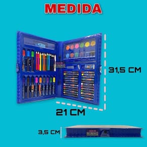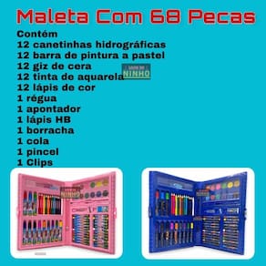 Maleta Escolar Pintura Infantil 68 Peças Canetinha Estojo O Estojo de Pintura além de ser um produto muito divertido, também auxilia no desenvolvimento de vários sentidos ca criança tais como, criatividade, percepção visual, coordenação motora, raciocínio lógico, etc. Um conjunto completo acondicionado em um estojo tipo maleta para melhor organização e transporte. Com ele a diversão está garantida. Idade recomendada: a partir dos 3 anos. Contém: 12 canetinhas hidrograficas 12 barra de pintura a pastel 12 giz de cera 12 tinta de aquarela 12 lápis de cor 1 regua 1 apontador 1 lápis HB 1 borracha 1 cola 1 pincel 2 clips do vendedor: 7 dias Marca: Não Informado