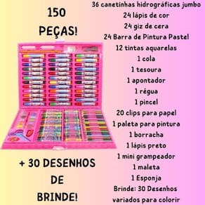 24 canetinhas hidrográficas 12 barras de pintura a pastel 12 gizes de cera 12 tintas aquarelas 12 lápis de cor 6 desenhos para colorir 5 clips 1 tesoura escolar 1 régua 1 apontador 1 lápis hb 1 borracha 1 esponja 1 pincel 1 paleta