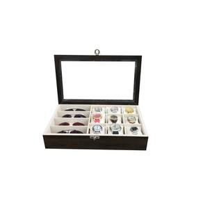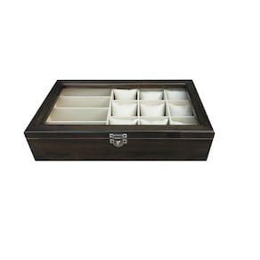 Prático e luxuoso, na linha madeira maciça encontrarmos um toque vintage, objeto decorativo onde são visíveis os veios naturais da madeira. Nossos estojos irão facilitar seu dia a dia com a organização e segurança que sua coleção precisa, além de proporcionar um ambiente mais sofisticado e elegante.Produzida com madeira natural de reflorestamento. Escolhida rigorosamente, totalmente tratada, tingida e envernizada externamente. Internamente, inclusive as divisórias são revestidas com nylon aveludado e as almofadas que acompanham o produto, normalmente são também em tecido aveludado. Na linha madeira maciça é possível observar os veios naturais da madeira. As dobradiças não são aparentes e possuem um limitador. A tampa possui visor com vidro transparente. Acompanha um fecho giratório de pressão em metal, ideal para colocar cadeado. Seus relógios sempre bem protegidos e acomodados confortavelmente, com toda segurança e facilidade no manuseio. Características da caixa:- Produto fabricado em madeira maciça de qualidade,- Não empena,- Ébano flocado de bege- Revestimento interno aveludado, inclusive as divisórias,- Fecho giratório de pressão em metal suporta cadeado ,- Tampa de vidro 2 mm,- Acompanha almofadas nos casulos para Relógio.- Porta óculos- Medidas aproximadas dos casulos para Relógio larg x comp x alt : 7,5 x 7,5 x 7,0 cm.Relógios e óculos não acompanham o estojo - Imagens meramente ilustrativas