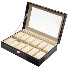 Estojo para 12 relógios com compartimentos individuais revestidos em veludo preto para organização e proteção contra riscos. Design elegante e compacto.Características