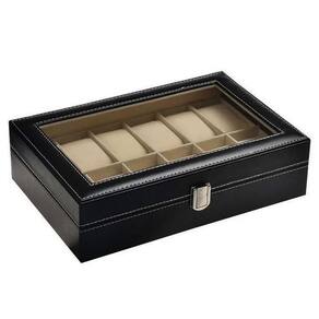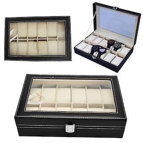 Estojo para 12 relógios com compartimentos individuais revestidos em veludo preto para organização e proteção contra riscos. Design elegante e compacto.Características