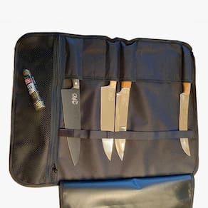 Estojo para facas e acessórios - Case - Churrasco - 7 itens Você quer levar suas facas e acessórios para cozinhar ou churrasco, olhe esse estojo, bolsa ou case. Para até 7 itens, facas, chaira, etc... Com fita prendedora interna e capa de proteção interna. Espaço para colocar sua identificação. Fica em formato de rolo Material Nylon 900 Tamanho: 88 x 16cm fechada em formato de rolo58 x 46cm aberta Com pegador plastico cilíndrico para carregar Atenção:Não acompanha facas e utensíliosFoto somente ilustrativaO uso depende do tamanho das facas e acessórios