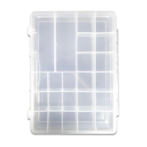 Equipamento indispensável para organizar as iscas e miudezas com segurança e limpeza. Ideal para o pescador que precisa manter suas tralhas bem organizada em viagens estocagem ou mesmo durante as pescarias, proteção e segurança. Possui trava abre-fecha com click para melhor segurança e Alça para Transporte Especificações: Incluso: 1 Estojo Organizadora para Pesca Dimensões CxLxA : 33cm x 23cm x 7,5 cm Divisórias casulos : 6 de 4,5 x 5cm + 6 de 5 x 5cm + 2 de 16 x 6cm removíveis e intercambiáveis Peso: 670g Composição: Aço e Polipropileno Cor: Transparente Origem: China Ean: 7894317710980