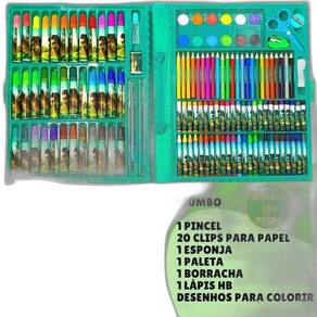 Conteúdo do Kit: A maleta contém: 24 canetinhas hidrográficas 12 barras de pintura a pastel 12 gizes de cera 12 tintas aquarelas 12 lápis de cor 6 desenhos para colorir 5 clips 1 tesoura escolar 1 régua 1 apontador 1 lápis HB 1 borracha 1 esponja 1 pincel 1 paleta