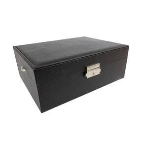 Valorize ainda mais sua coleção de joias. Estojo porta joias, feito de madeira e revestido externamente de PU e internamente de flanela. Costura em tom branco, dando mais elegância aos seus relógios. Acomodam perfeitamente e com segurança, pulseiras, brincos, colares e anéis. Seu fecho prateado é muito bonito e reforçado, não deixando que o estojo se abra em qualquer descuido e com chave. Tamanho do estojo : 8 cm X 23 cm X 17 cm.