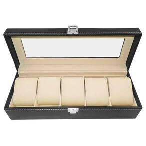 Valorize ainda mais sua coleção de relógios. estojo para 6 relógios, feito de madeira e revestido externamente tecido sintético e internamente de veludo. costura em tom branco, dando mais elegância aos seus relógios. acomodam perfeitamente e com segurança, relógios femininos ou masculinos. seu fecho prateado é muito bonito e reforçado, não deixando que o estojo se abra em qualquer descuido. tamanho do estojo para 5 relógios: 25 cm X 11 cm X 8 cm. com tampa em plástico super reforçado com aparência idêntica ao vidro. são 5 almofadas distribuídas em casulos devidamente separados por repartições também aveludadas. cada casulo 4,5cm X 8,5 cm , vem acompanhado de uma almofada de veludo para acomodar e proteger o relógio