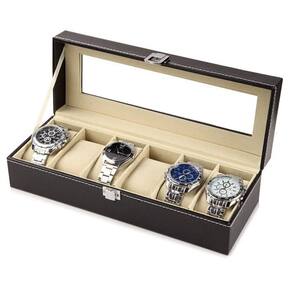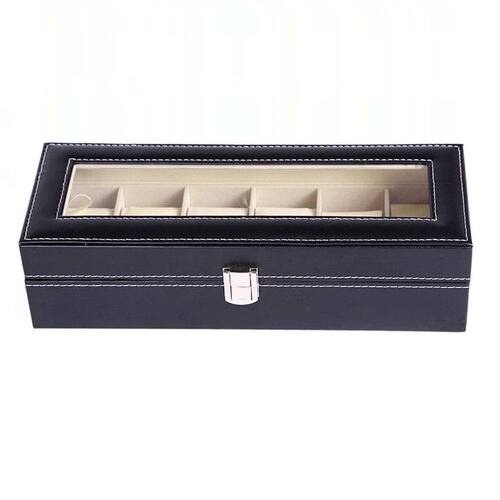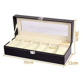 Valorize ainda mais sua coleção de relógios. estojo para 6 relógios, feito de madeira e revestido externamente de courino e internamente de veludo. costura em tom branco, dando mais elegância aos seus relógios. acomodam perfeitamente e com segurança, relógios femininos ou masculinos. seu fecho prateado é muito bonito e reforçado, não deixando que o estojo se abra em qualquer descuido. tamanho do estojo para 6 relógios: 30 cm X 11 cm X 8 cm. com tampa em plástico super reforçado com aparência idêntica ao vidro. são 6 almofadas distribuídas em casulos devidamente separados por repartições também aveludadas. cada casulo 4,5cm X 8,5 cm , vem acompanhado de uma almofada de veludo para acomodar e proteger o relógio.